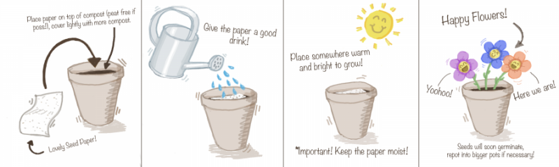 Some of the small ones can be sprinkled right on the soil surface. Larger seeds will need to be buried. After planting seeds, you have to moisten the newly planted seeds. To speed up germination, cover the pots with wet paper or a plastic dome. This helps keep the seeds moist before they germinate. When you see the first signs of green, you have to remove the cover.