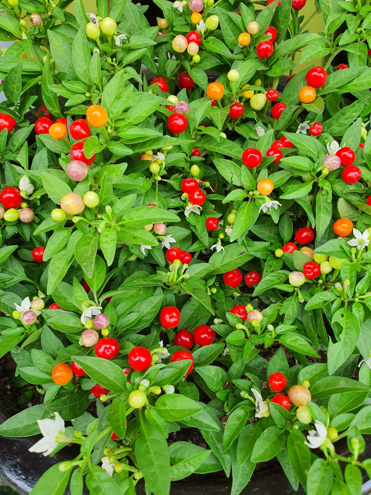 The young peppers start as glossy, deep green pods with a slight purplish tint. As they ripen, they gradually shift from purple to yellow, then orange, and finally develop a fiery red hue at full maturity. What makes the Chinese Five-Color Pepper truly extraordinary is the simultaneous presence of peppers in all of these vibrant colors on a single plant, creating a visually striking and colorful display in gardens and on dinner plates.
